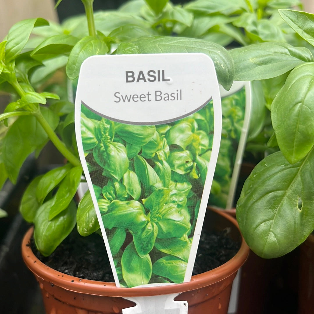 Basil 'Sweet' bright green, strongly automatic leaves with a distinctive flavour. Easy to grow in moist, well-drained soil, it also helps repel flies when placed near windows. Regular watering and harvesting encourage healthy growth. Protect it from frost to enjoy its unique taste all season. Companion plant with chilli, eggplant, tomatoes and beetroot to reduce pests.